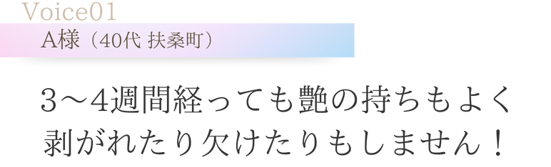 3〜4週間経っても艶の持ちもよく、剥がれたり欠けたりもしません。大満足です。