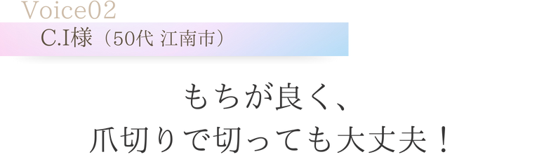 飲食店での仕事なので洗い物で爪が欠けたり割れて2枚づめになる事が悩みでした。ネイル後はそれがなくなって嬉しいです。