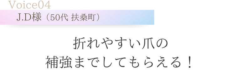 折れやすい爪の補強などもしてもらえ、とても頼りにしております。